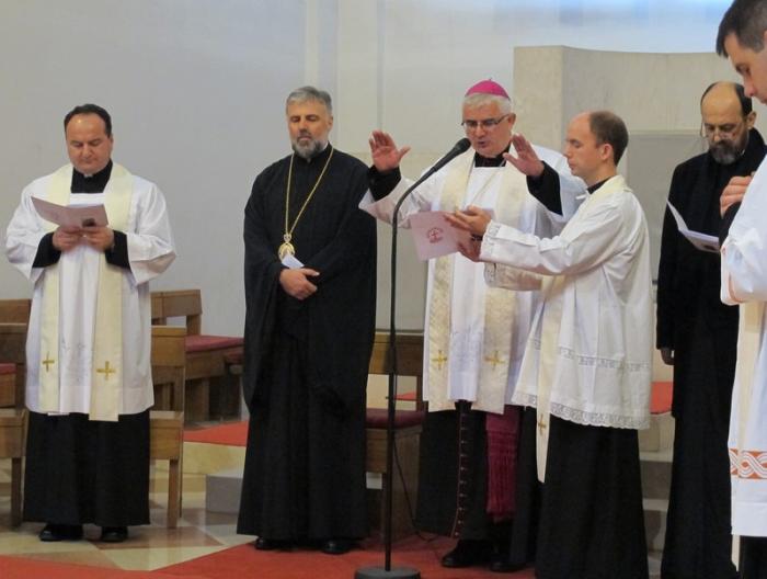 Pozdravljajući na početku okupljene biskup Uzinić je rekao da se ova molitvena osmina odvija pod geslom „Zar je Krist razdijeljen?“ te nastavio: „I doista gledajući Crkvu čini nam se da je i Krist razdijeljen. No, naša večerašnja prisutnost ovdje, a pripadamo različitim Crkvama, želi reći da je to samo privid, da Krist nije razdijeljen. Zahvaljujem svima koji su došli večeras ovdje da bi to pokazali,“ i koji će to popratiti molitvom. Posebno je zahvalio „našem najdražem gostu“ episkopu Grigoriju pozdravljajući ga „kao brat brata, kao biskup biskupa.“ „Svjesni smo svi da su ovi naši molitveni koraci tek maleni koraci na putu prema vidljivom jedinstvu Crkve, ali znamo i da do jedinstva i ne može doći nekim velikim koracima, da se jedinstvo ne može nametnuti, da ono možete doći samo odozdo i samo ako je popraćeno molitvom,“ istaknuo je biskup Uzinić.